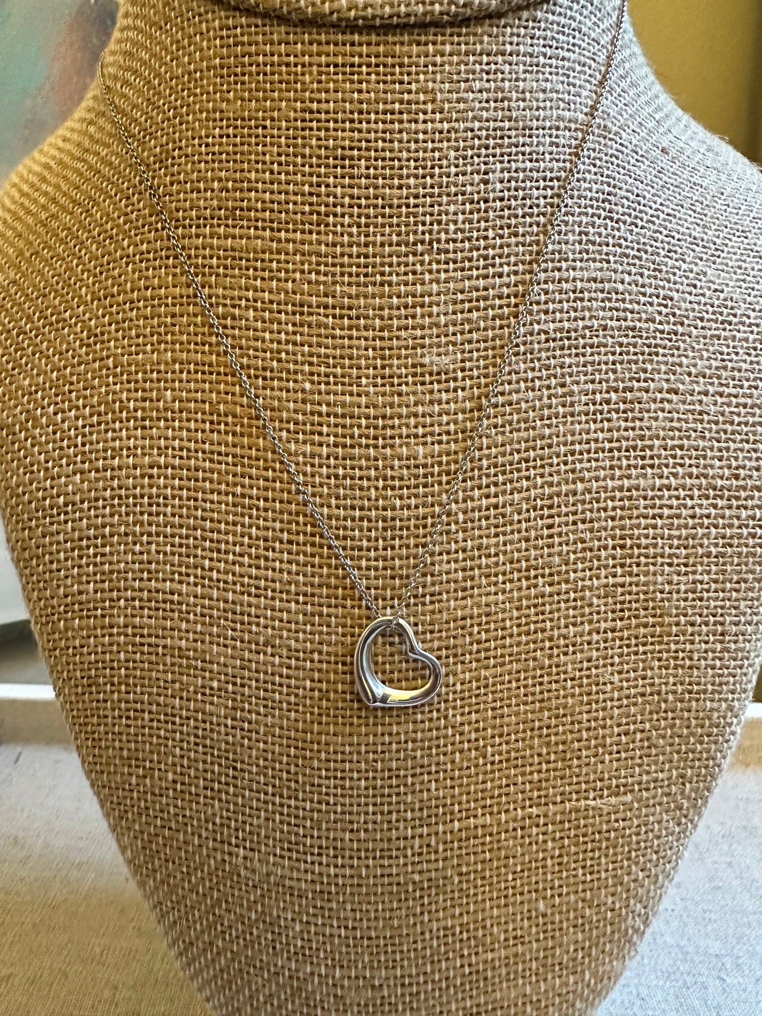 Tiffany Sterling silver open heart necklace. Chain measures 16” and heart measures a little over 1/2”. It is in very good vintage condition, may shoes slight signs of wear.