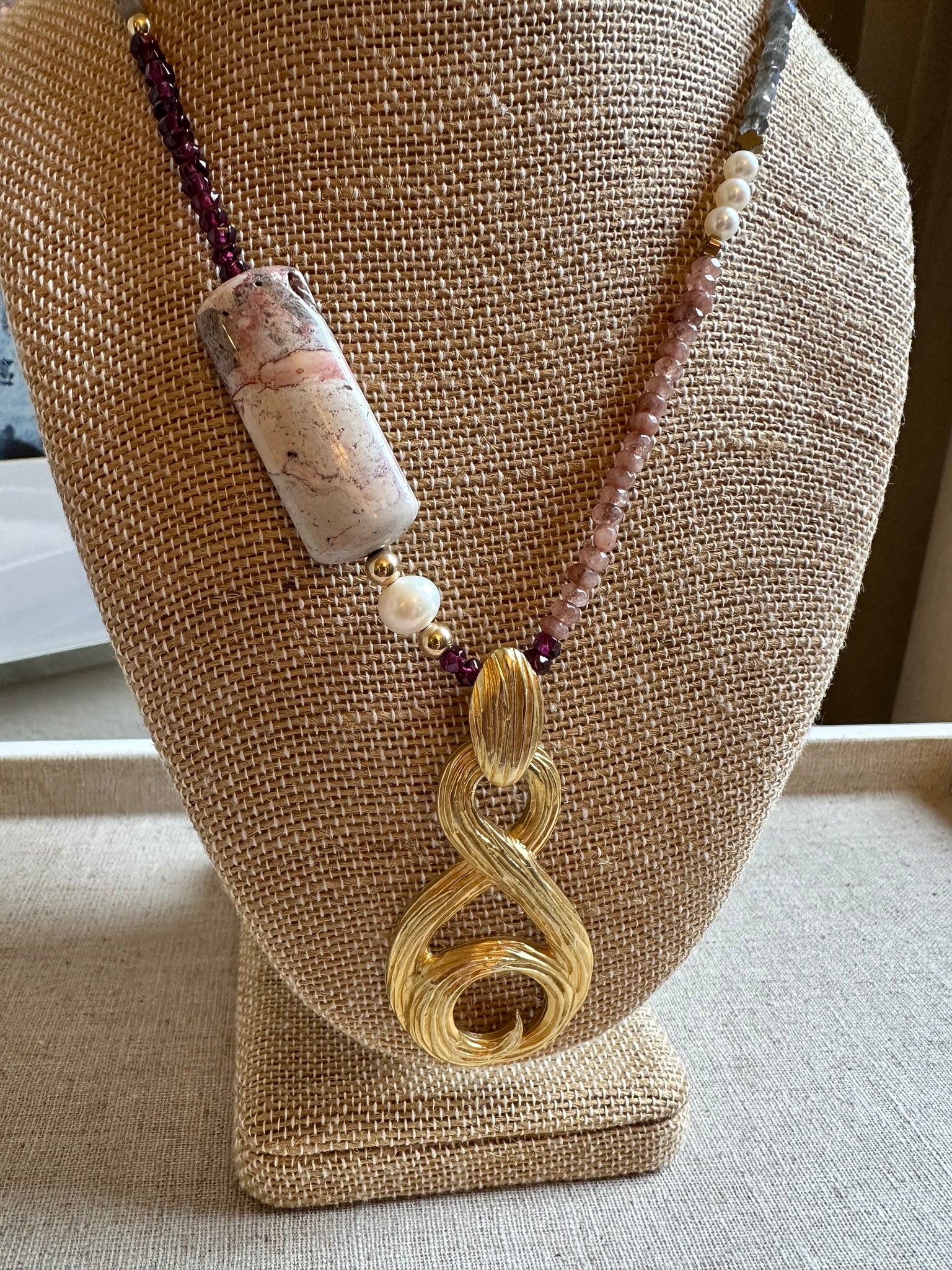 This is a mixed stone necklace with shades of garnet and grays with a beautiful gold tone vintage pendant that can be removed. It measures about 18” long and pendant measure about 2.5” long.