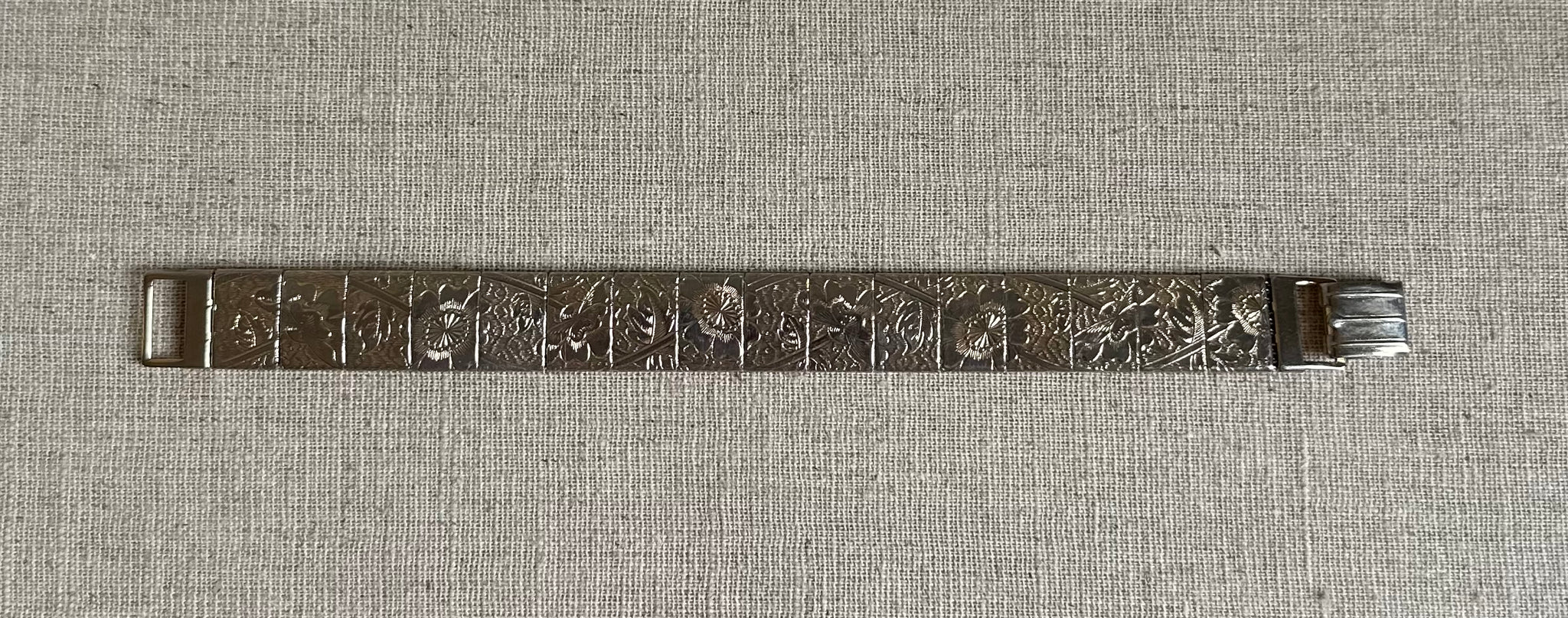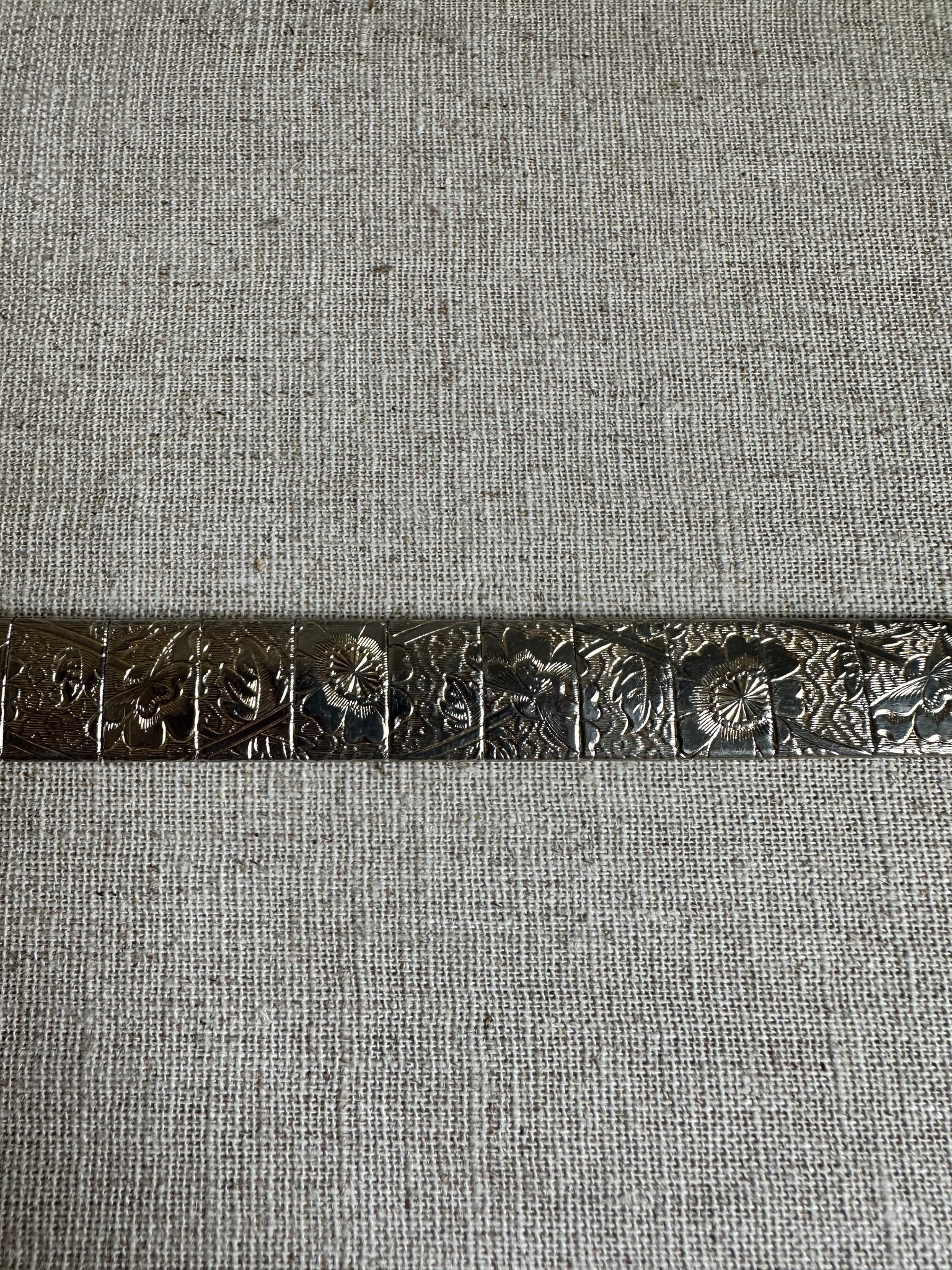 Vintage gold tone floral bracelet. Measures 6 3/4” and is in good vintage condition, some slight wear on back. See 3rd picture.