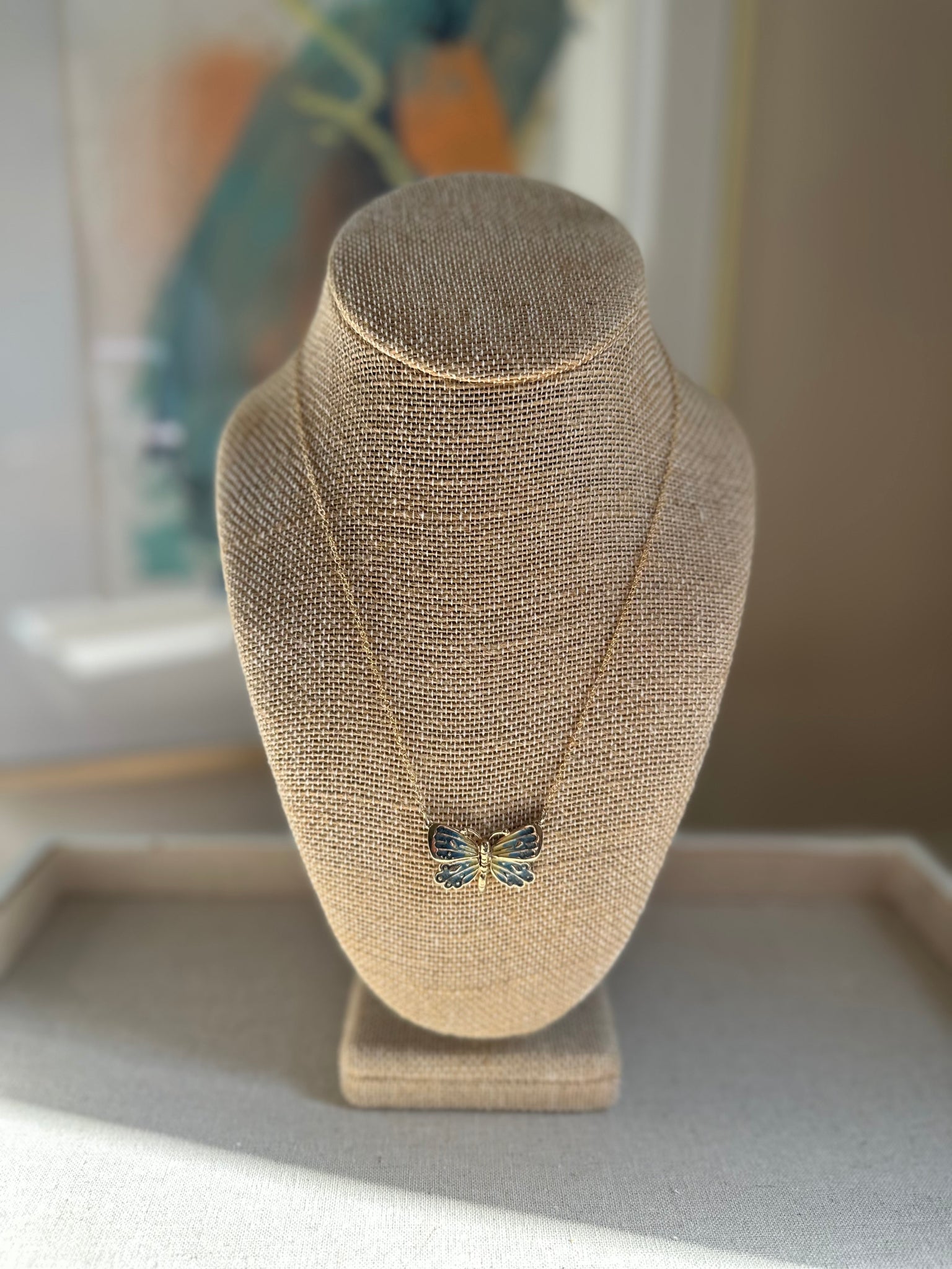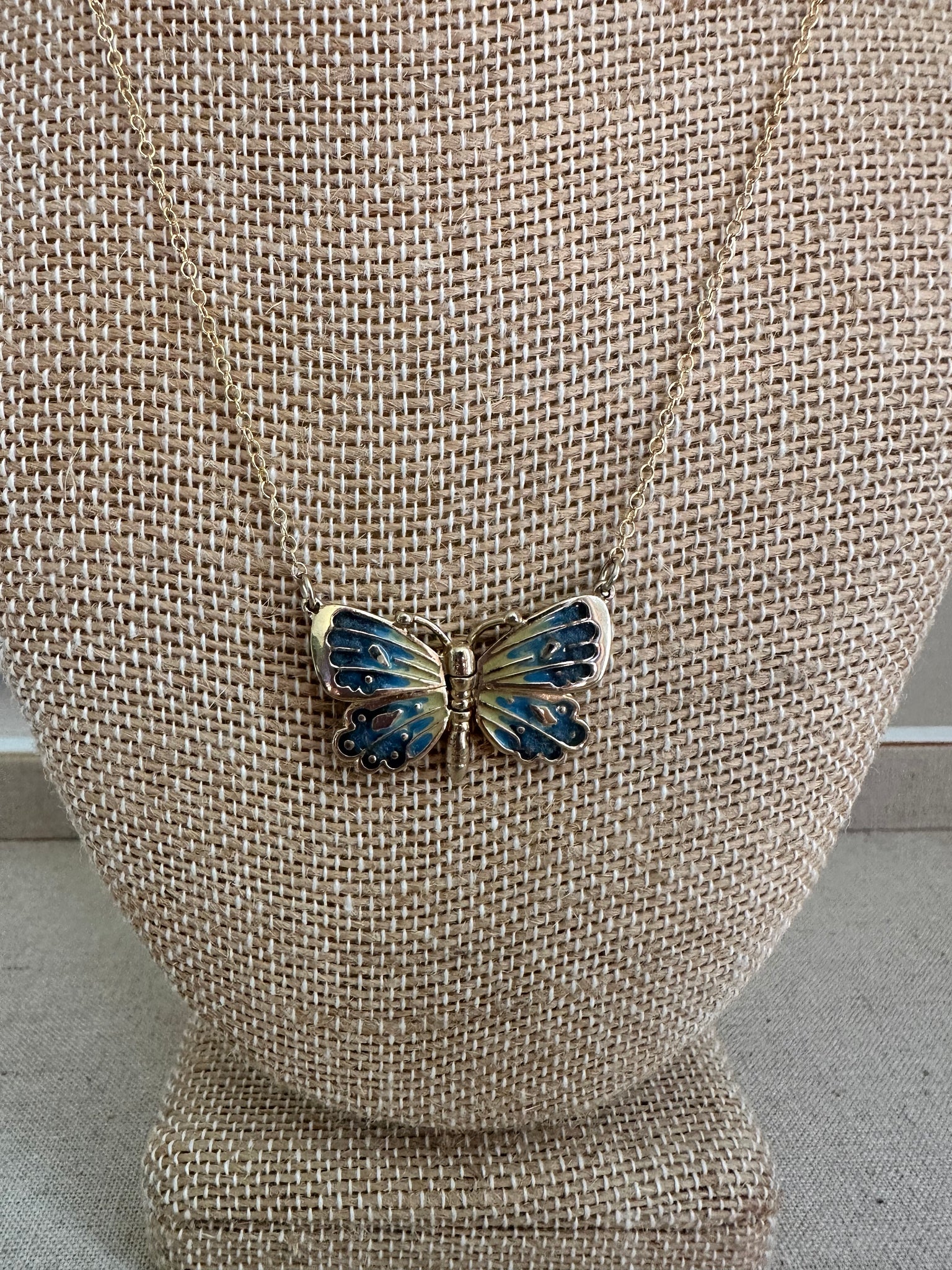 Vintage articulated butterfly pendant with a new gold filled chain. Measures about 17”