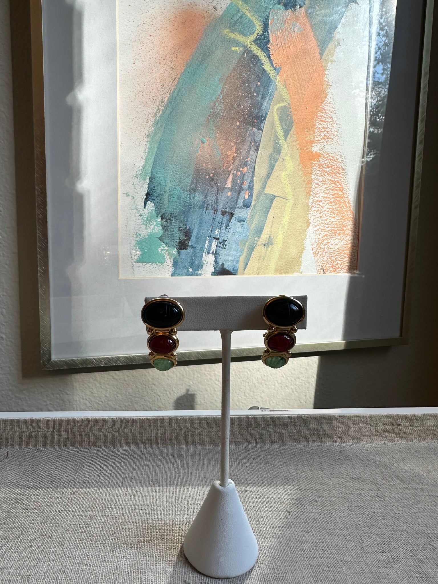 Vintage Carved Scarab Gold Tone Clip Earrings Black Red Green Stone/Glass