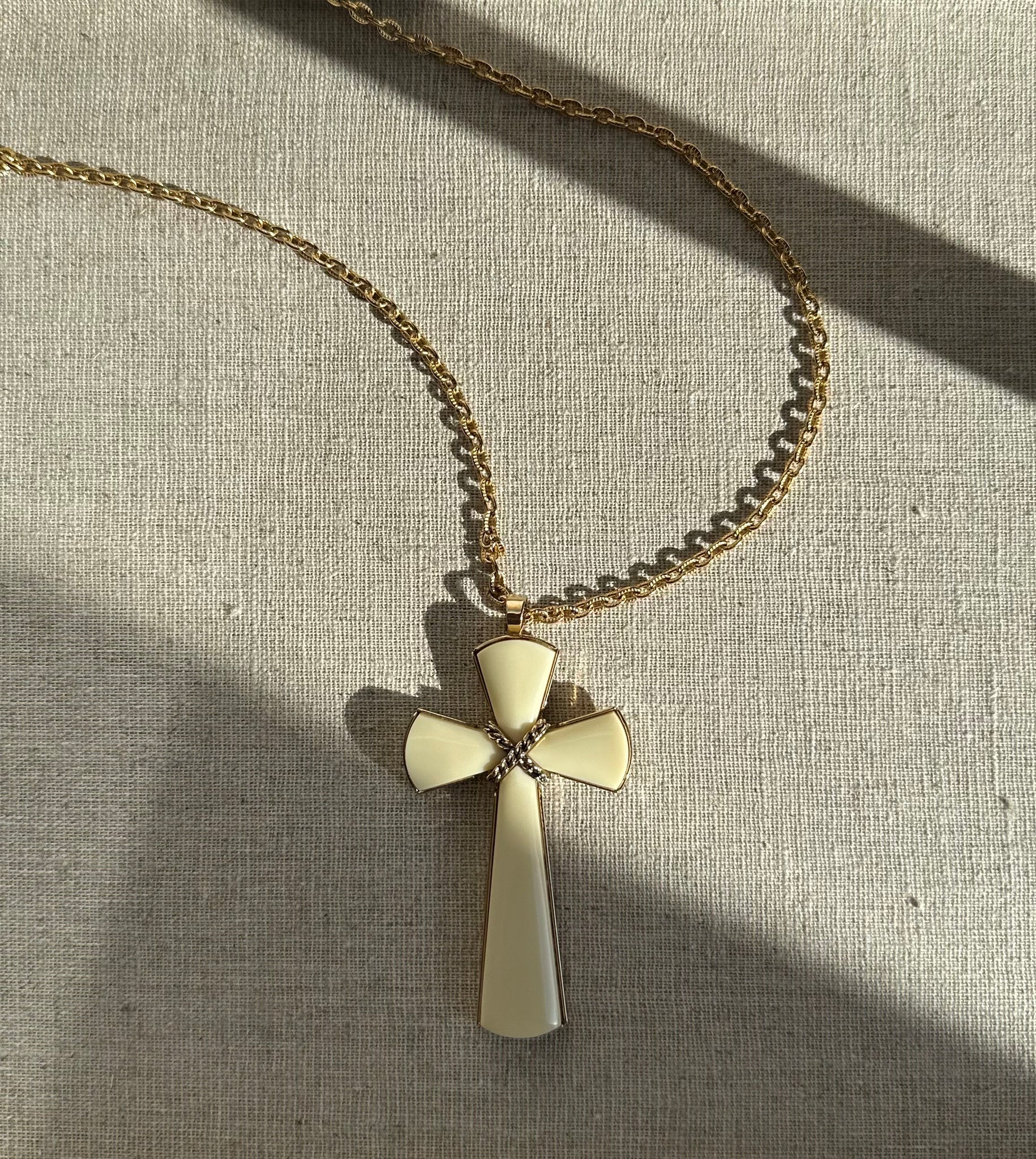 Vintage cross gold tone necklace measures about 26” and cross measures about 2.5”. It is in good vintage condition, may show slight signs of wear.