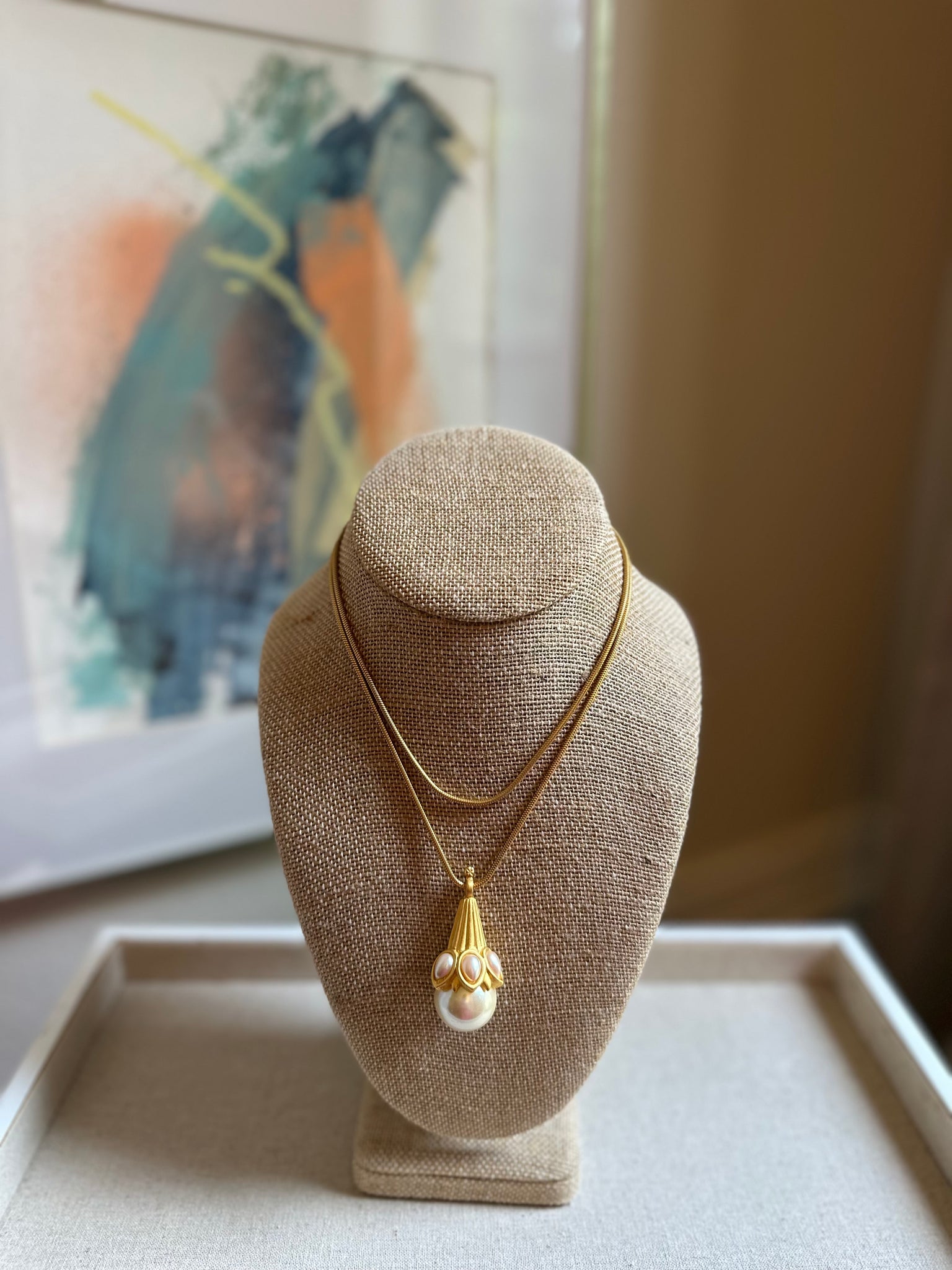 Vintage faux pearl necklace. In good condition, may show slight signs of wear. Measures 30” and pendant is 2”
