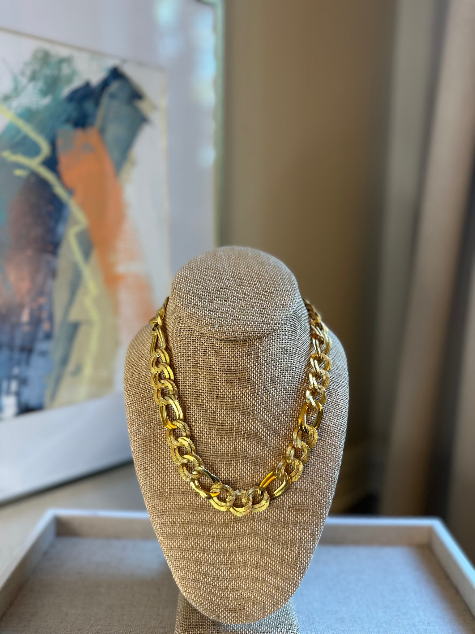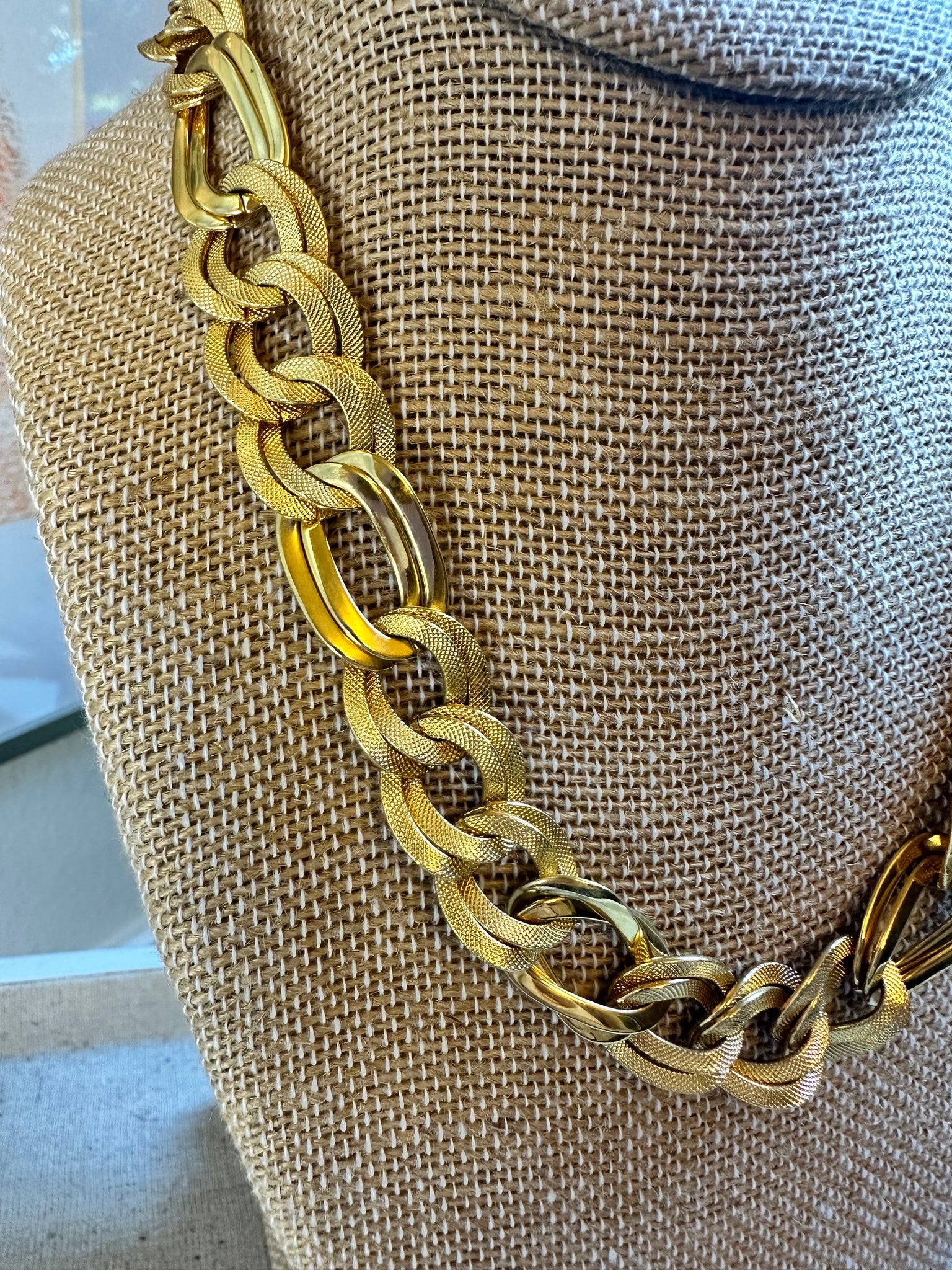 Vintage unsigned gold tone necklace in good condition, may show slight signs of wear. Measures about 18”