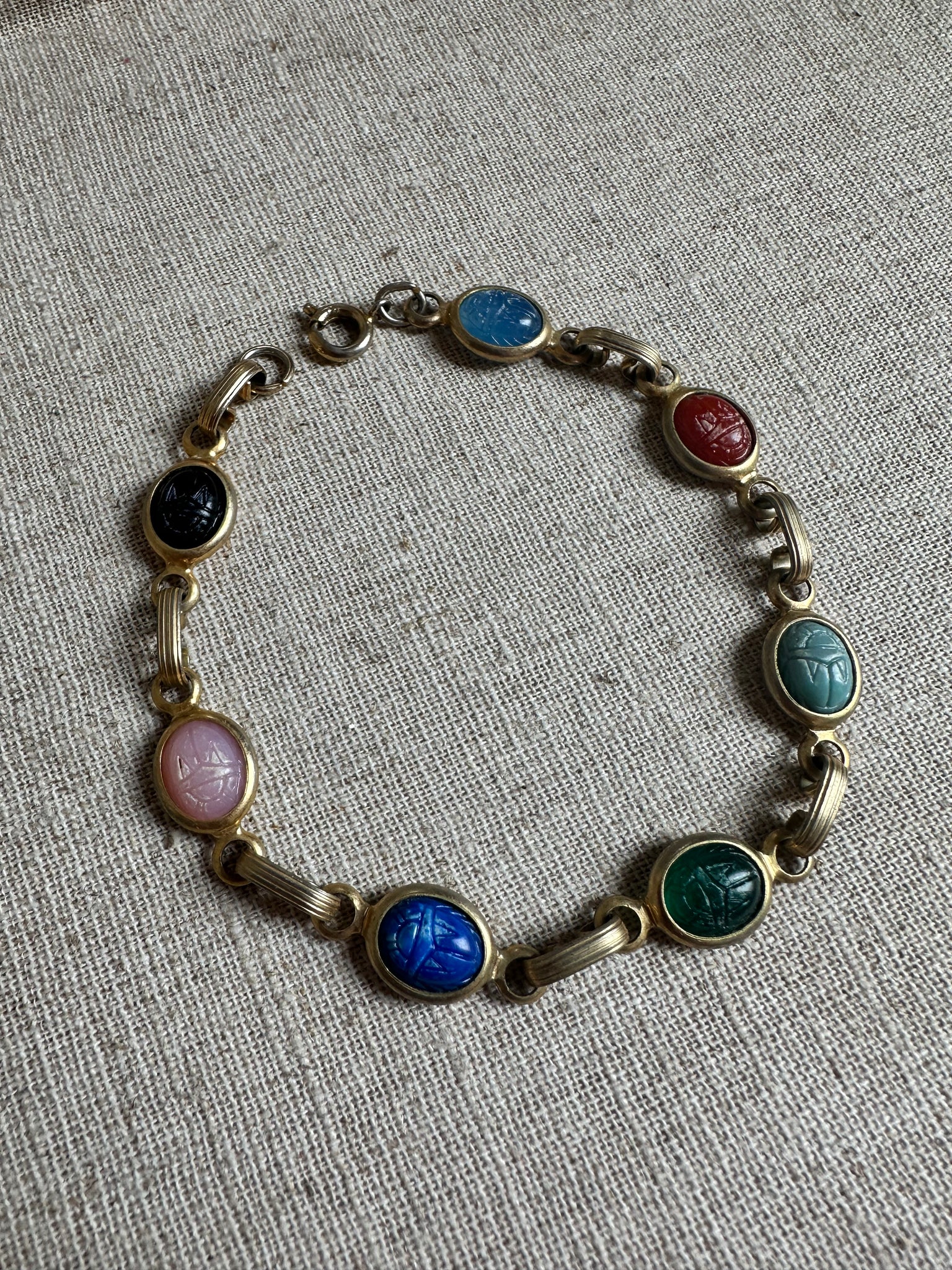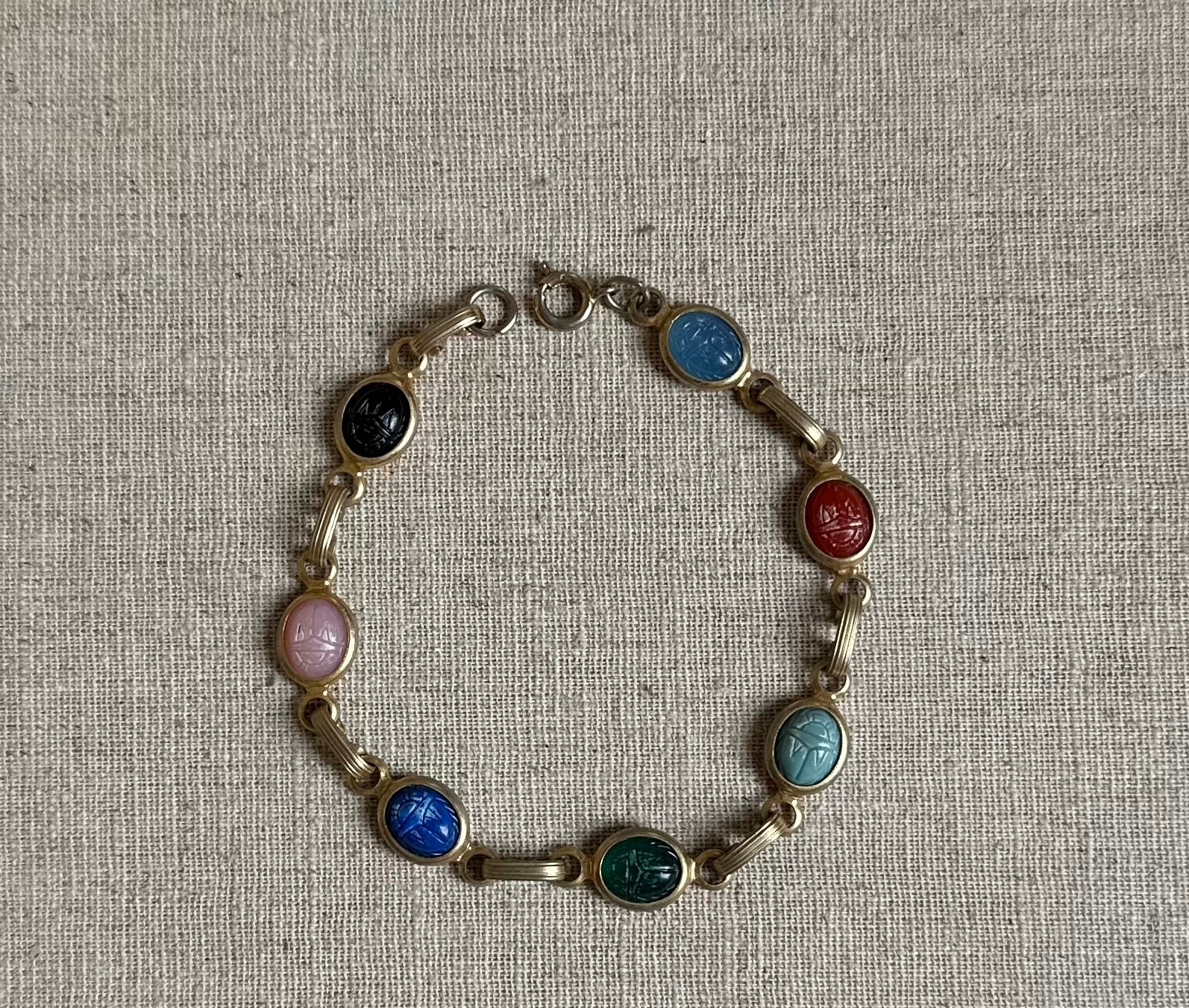 Vintage gold tone and multicolor stone bracelet. It is in good condition, shows slight wear. Measures about 8”